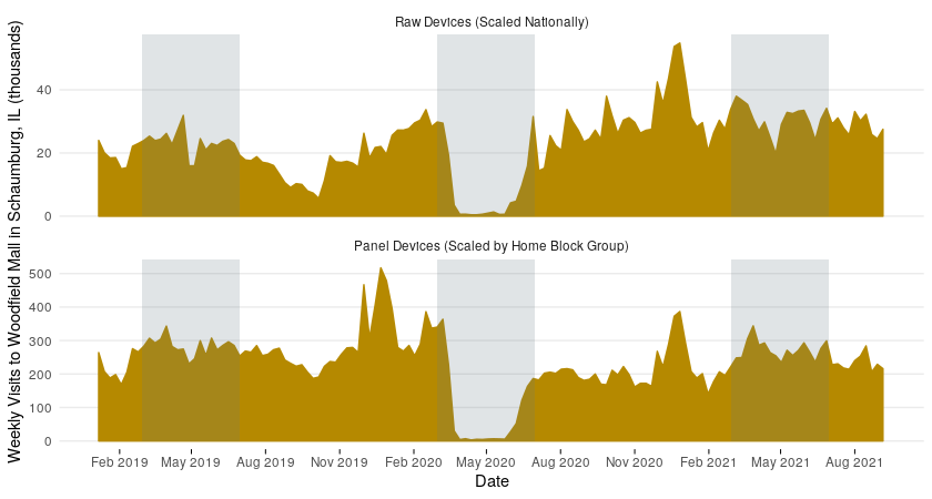 Let us look at an example where we use our panel of devices to estimate the number of visits longer than 15 minutes to Woodfield Mall in Schaumburg, Illinois. Below November, December, and January are highlighted for the two winters in this timeframe. These months are peak shopping season at a mall, and we expect that due to COVID-19 the winter 2019-2020 visits will be higher than in the 2020-2021 winter. We can see that scaling all raw devices directly (top sub-figure) does not capture this reality, and that the panel approach does (bottom sub-figure). This is because the number of raw devices in the Chicago area in the later part of the timeline increased as compared to 2019 due to fluctuations in data feeds.